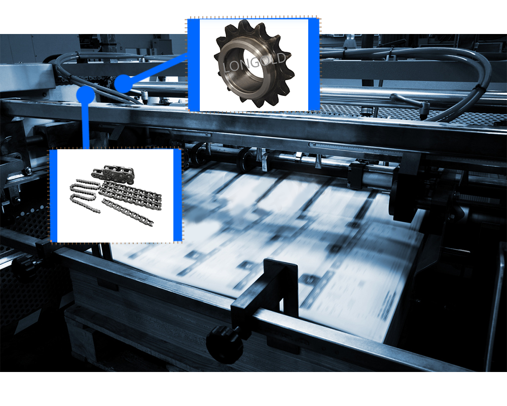 印刷設(shè)備通常需要較大的動(dòng)力來(lái)驅(qū)動(dòng)各個(gè)部件的運(yùn)動(dòng),隆德的傳動(dòng)鏈和鏈輪可以將動(dòng)力從電機(jī)等動(dòng)力源傳遞到印刷設(shè)備的各個(gè)部位,確保設(shè)備的正常運(yùn)行。圖中為滾子鏈和鏈輪組合來(lái)為印刷設(shè)備傳動(dòng)動(dòng)力。 |
