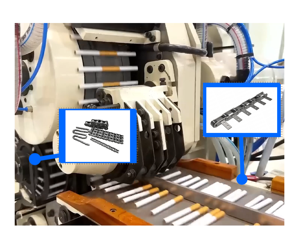 煙草機(jī)械輸送鏈條參與成品與包裝的輸送,傳動(dòng)鏈驅(qū)動(dòng)包裝機(jī)械進(jìn)行包裝。