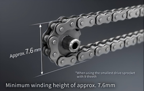 “不銹鋼規(guī)格Epsilon Chain”可非常緊湊地進(jìn)行卷掛,適用于狹小且復(fù)雜的布局空間。