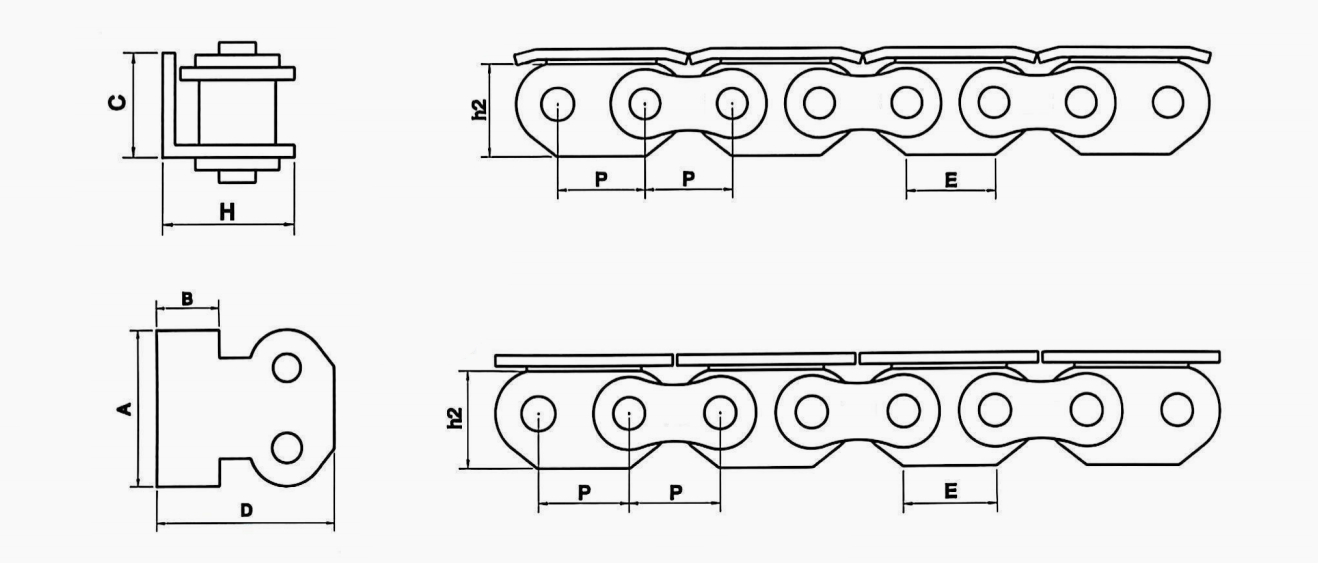 內(nèi)鏈板加高,鏈條帶頂板,有A/B兩種型號(hào),A型頂板兩端略帶折彎,B型鏈板為水平頂板。