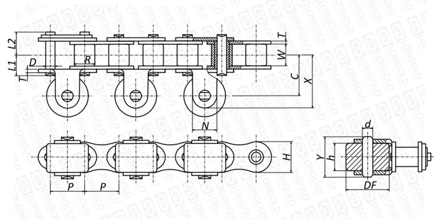 本體鏈條為標(biāo)準(zhǔn)滾子鏈條,單側(cè)帶具有導(dǎo)向作用的滾輪,有利于防止鏈條蛇形。