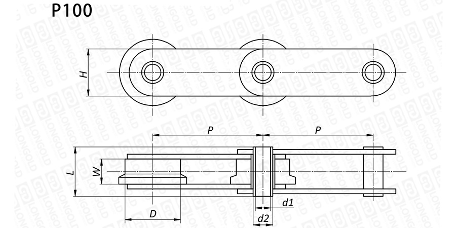 上圖為不銹鋼空心銷軸鏈P100型的結(jié)構(gòu)圖。