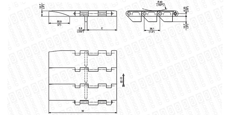 上圖為1 1/2"節(jié)距重載鏈板 UCCG ATM系列的結(jié)構(gòu)圖,圖紙中已標(biāo)明部分尺寸。