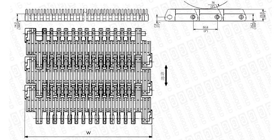 上圖為2"節(jié)距重載凸肋網(wǎng)帶 3110系列的結(jié)構(gòu)圖,圖紙中已標(biāo)明部分尺寸。
