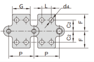 上圖為S滾子鏈雙倍節(jié)距鏈帶附件圖,R滾子型的附件尺寸也與其相同。