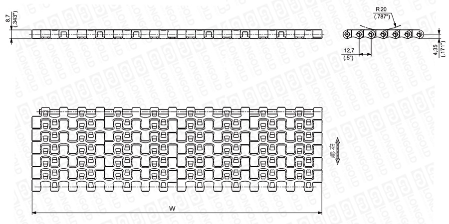 上圖為1/2"節(jié)距網(wǎng)帶與鏈板 200系列的結(jié)構(gòu)圖,圖紙中已標(biāo)明部分尺寸。