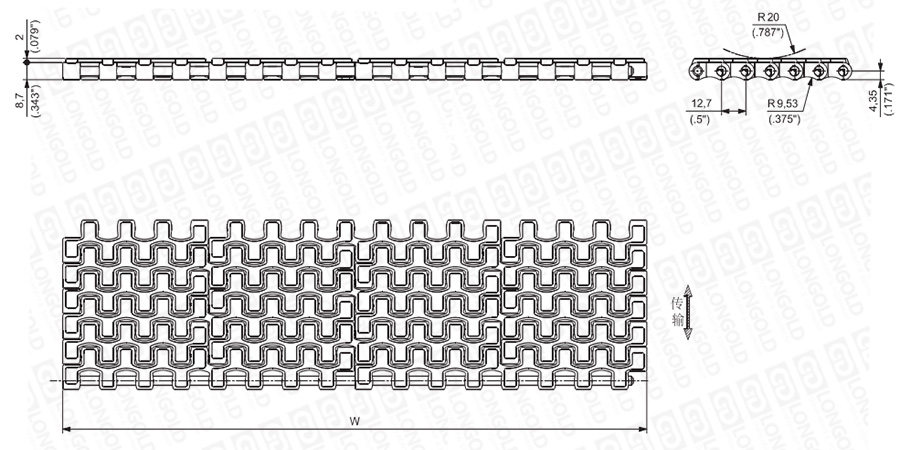 上圖為1/2"節(jié)距網(wǎng)帶與鏈板 HF200系列的結(jié)構(gòu)圖,圖紙中已標(biāo)明部分尺寸。