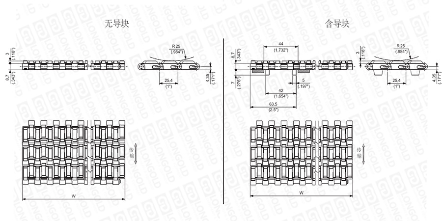 上圖為1"節(jié)距輕載網(wǎng)帶與鏈板 HF1600系列的結(jié)構(gòu)圖,圖紙中已標明部分尺寸。