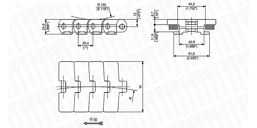 上圖為1"節(jié)距轉(zhuǎn)彎鏈板 783T系列的結(jié)構(gòu)圖,圖紙已標明本體尺寸。