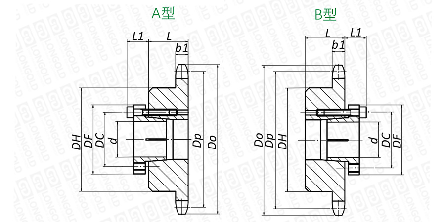 上圖為2050R雙倍節(jié)距鎖式鏈輪的結(jié)構(gòu)圖。