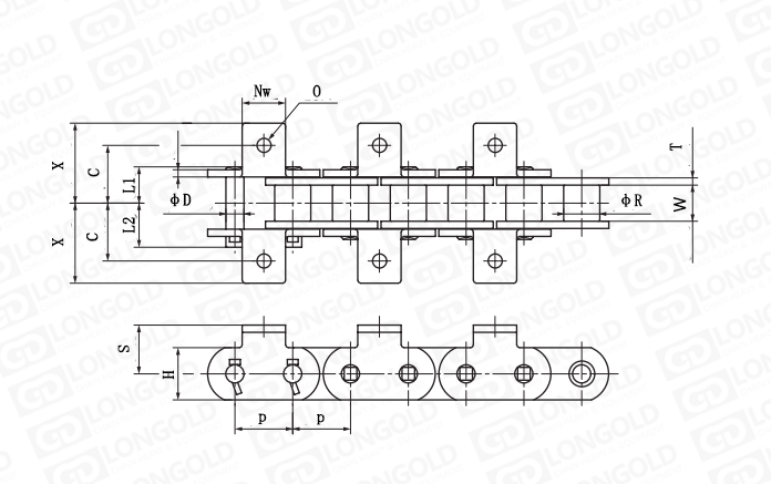 鏈條本體為雙倍節(jié)距鏈條,因此更適合用于對(duì)鏈條工作要求更加嚴(yán)苛的場合,同時(shí)鏈條帶K1附件,用以安裝特定部件來滿足工作條件。