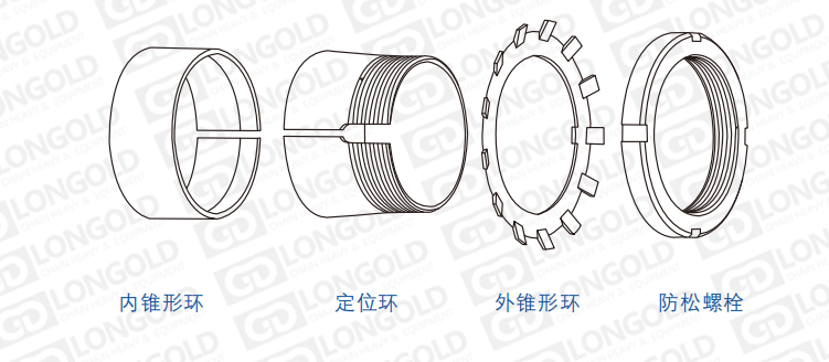 擰緊帶外錐?內(nèi)環(huán)上的圓螺?,帶動內(nèi)環(huán)軸向移動,壓緊帶錐?的外環(huán),產(chǎn)?徑向壓?和摩擦?,實現(xiàn)輪轂與軸的?鍵聯(lián)結(jié)。
