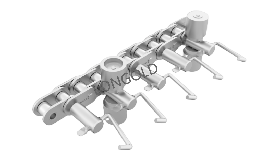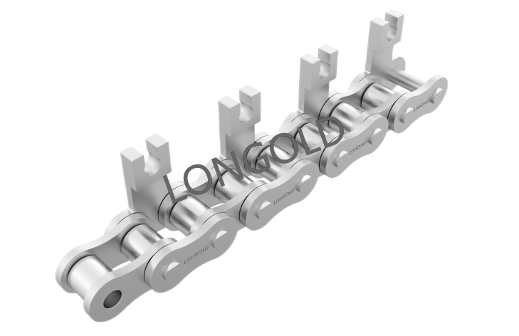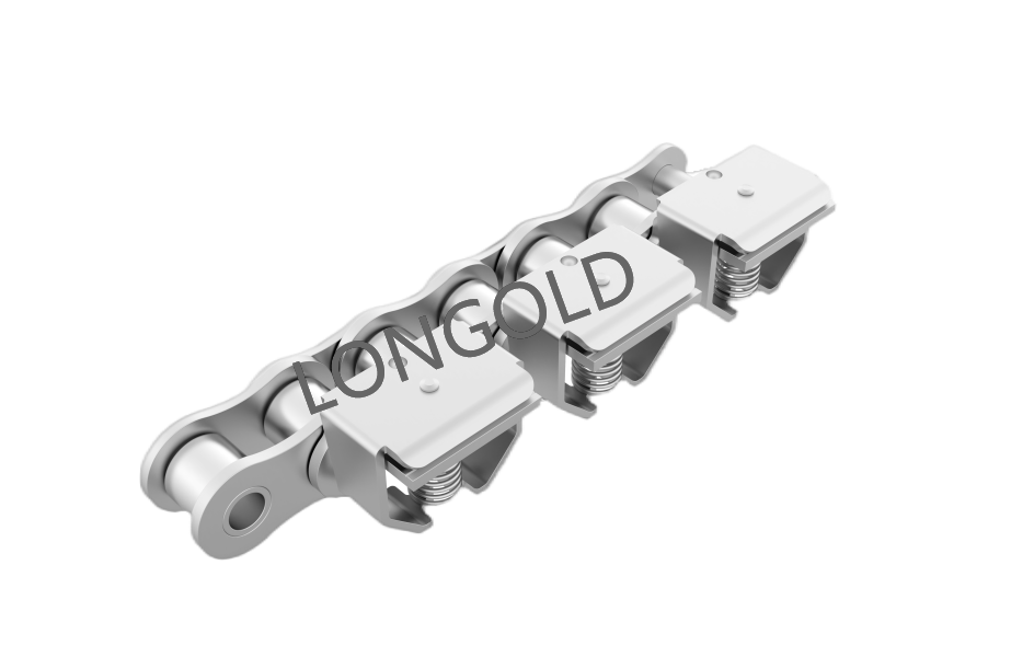 鏈條本體采用35(06C)鏈條,外鏈板采用特殊附件的結(jié)構(gòu),鏈板向上延伸加裝齒片。采用不銹鋼SUS304材質(zhì),用于電子行業(yè)的電子元件生產(chǎn)輸送線