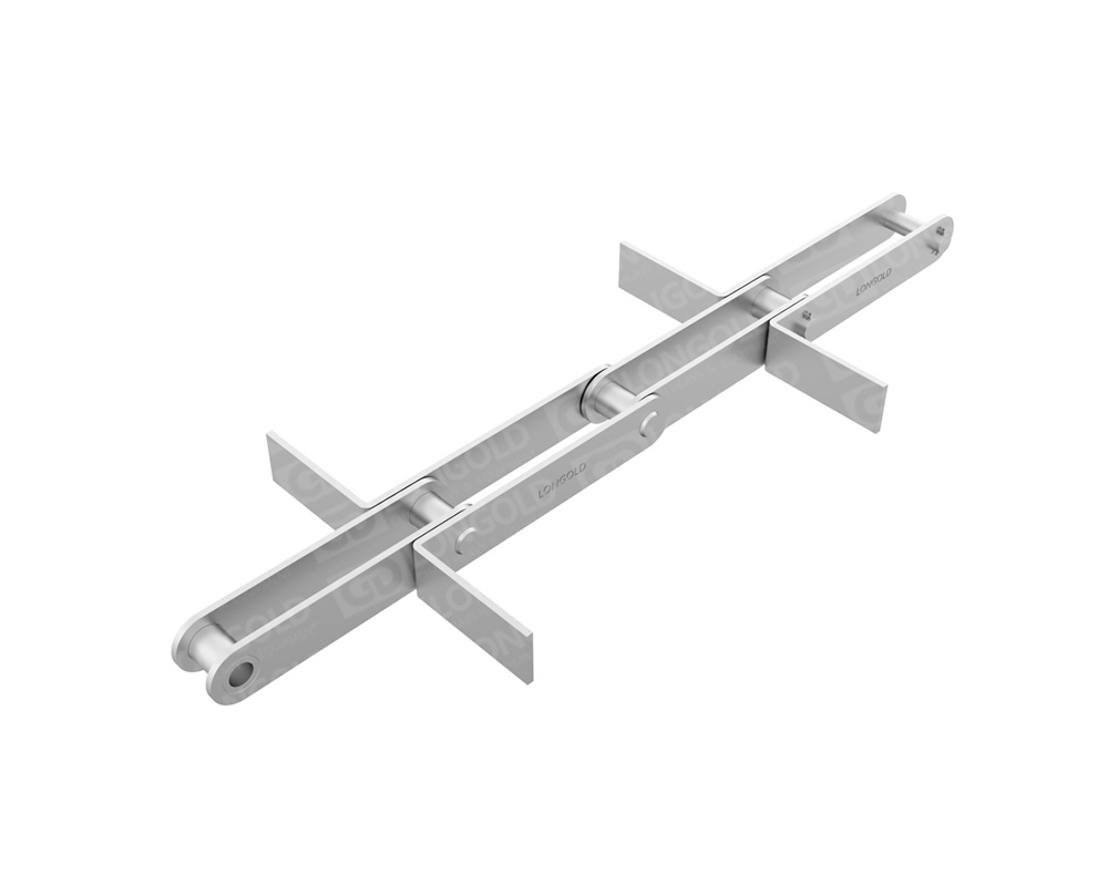 不銹鋼刮板輸送鏈由只起牽引作用的基本鏈節(jié)與完成刮送作業(yè)的帶刮板的鏈節(jié)組成。刮板輸送鏈結(jié)構(gòu)簡單,只要依次將一個鏈節(jié)的尾桿插入相鄰鏈節(jié)的叉頭,推入銷軸組成鉸鏈
