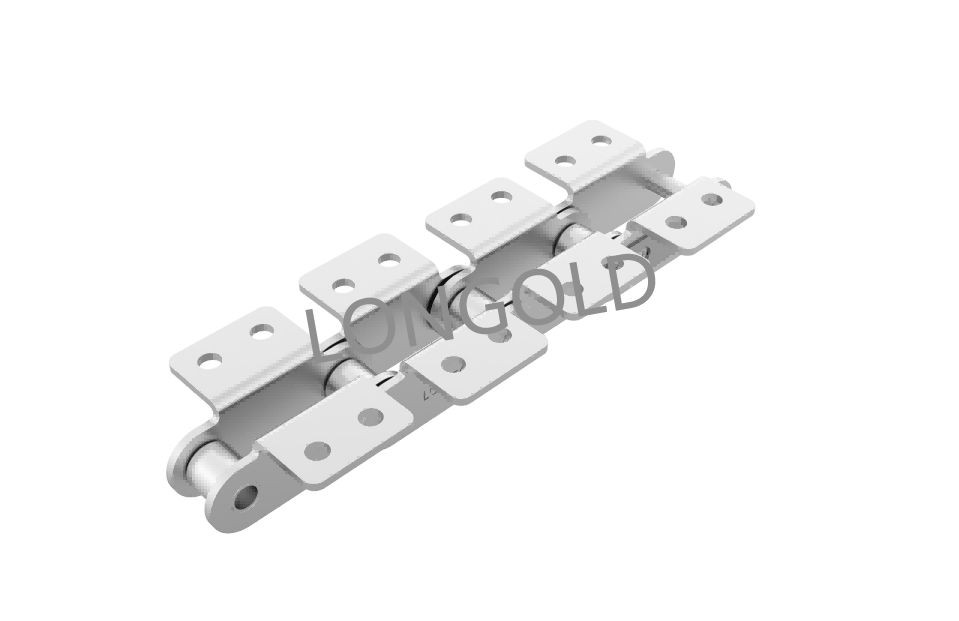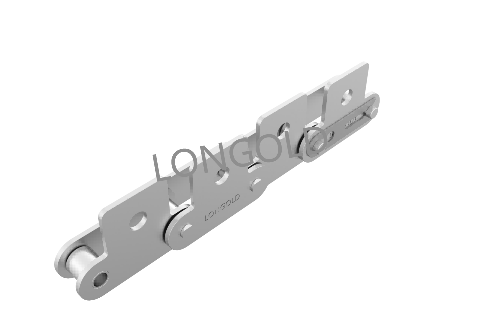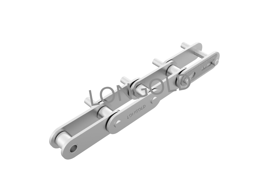 銷子和套筒之間插入特殊工程塑料制襯套,不論在干燥的環(huán)境還是淋水環(huán)境、甚至在水中也可不加油并長(zhǎng)壽命使用的不銹鋼雙倍節(jié)距鏈條,且鏈條的單側(cè)銷軸延長(zhǎng)的附件形式,除標(biāo)準(zhǔn)加長(zhǎng)銷附件,也可以根據(jù)客戶需求定制非標(biāo)附件,如帶臺(tái)階的加長(zhǎng)銷附件等。