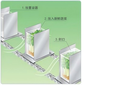 用于新鮮蔬菜包裝機。放置容器~放入新鮮蔬菜~封口,需要數(shù)道工序。間歇搬運,定位精度要求高。