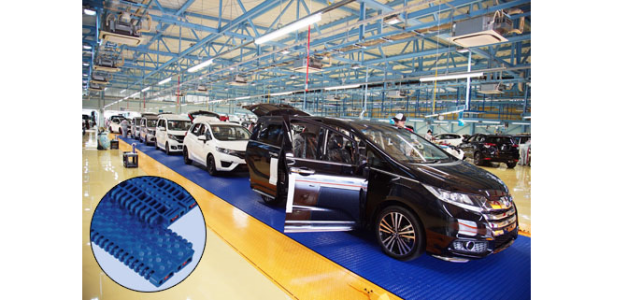 鏈條表面采用特殊凹凸構(gòu)造,可防止作業(yè)人員滑倒。表面沒有突起,可防止因作業(yè)臺(tái)車顛簸引起的工具掉落。塑料特有的低回彈性質(zhì)還可減輕作業(yè)人員的腳部的負(fù)擔(dān)。