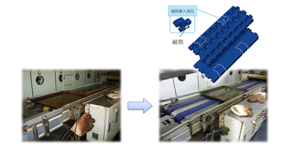 使用鏈條內(nèi)部嵌入磁鐵的塑料頂板鏈條后,磁鐵的磁力吸住托盤,使托盤不再滑動(dòng)。